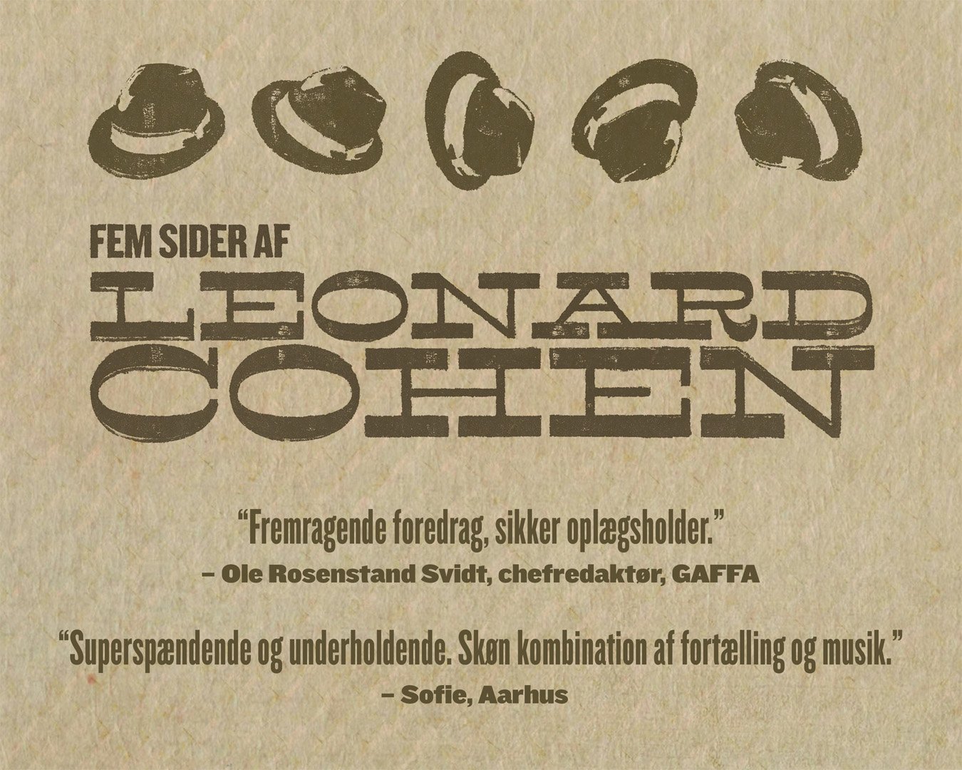 Foredraget rummer masser af bidder fra Cohens sange. Både dem, man helt sikkert kender, og nogle af de knapt så kendte – ligesom der vil være optagelser fra hans koncerter.